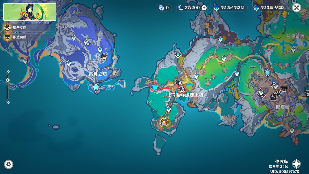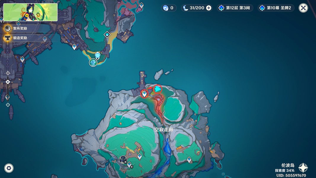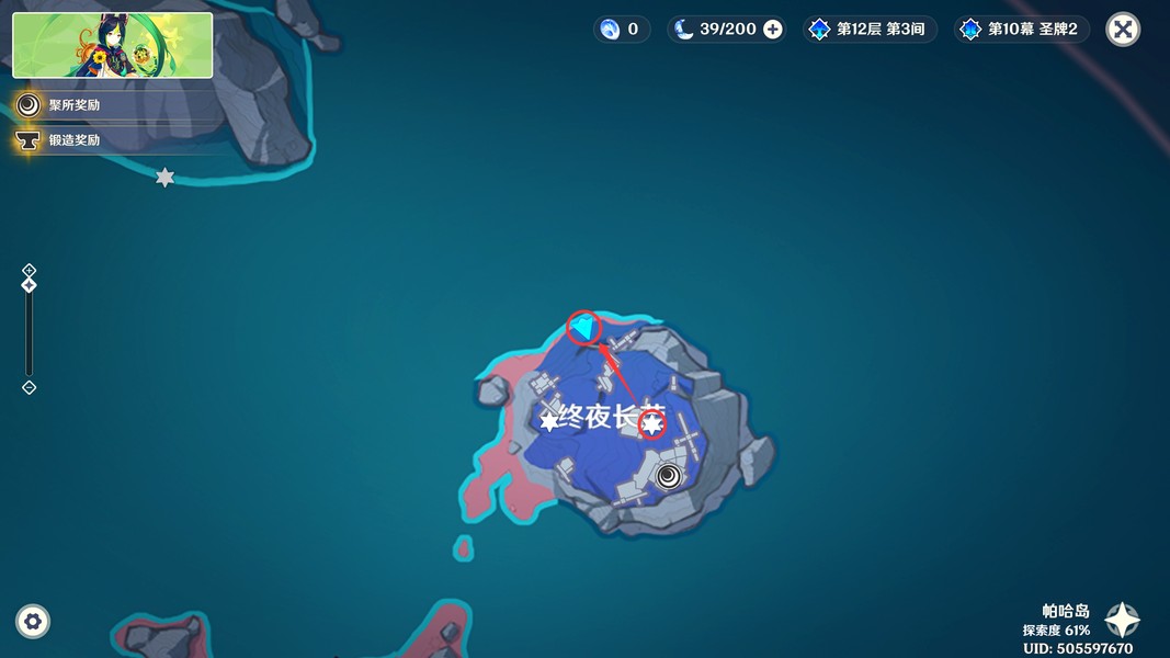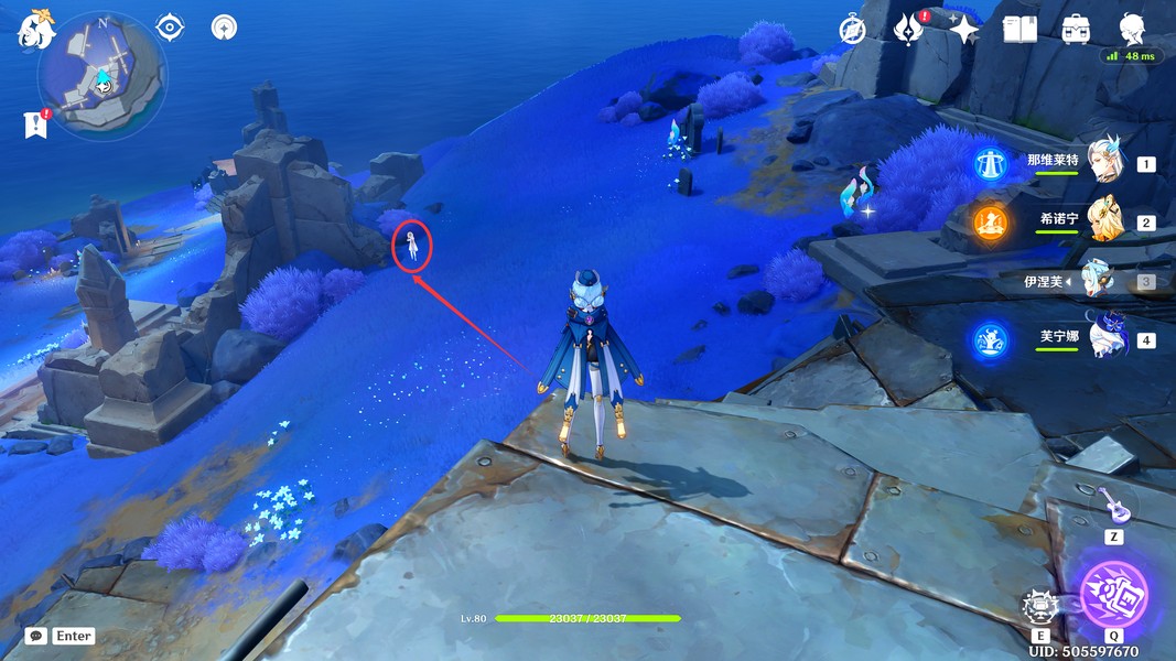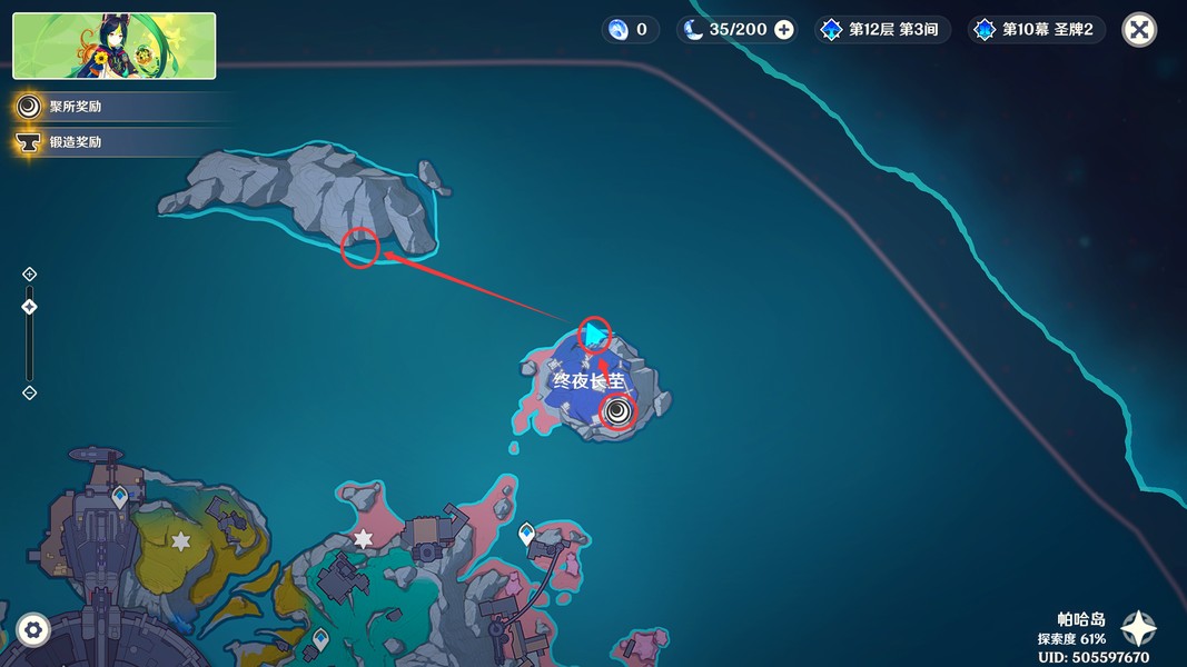这里我们传送到「聚所·终夜长茔」,来到下图位置(海上可以利用「月灵旅路」前进)