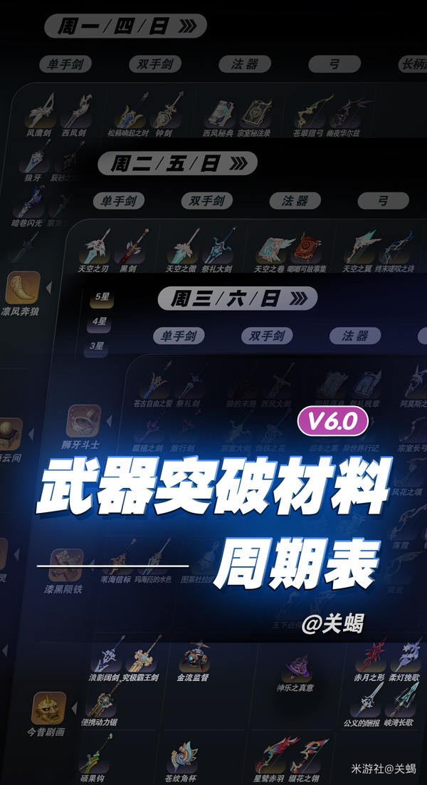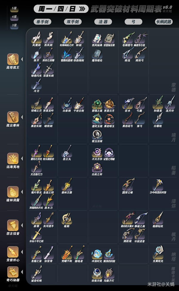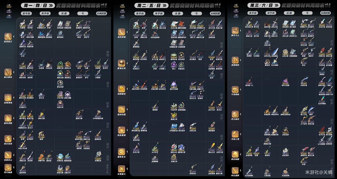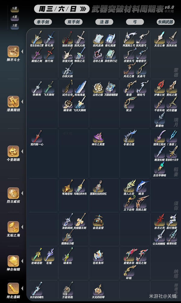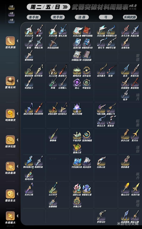 以及目前版本全5星武器、4星武器,以及3星武器的升级突破材料秘境(限时开启)周期表;