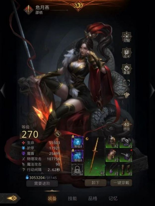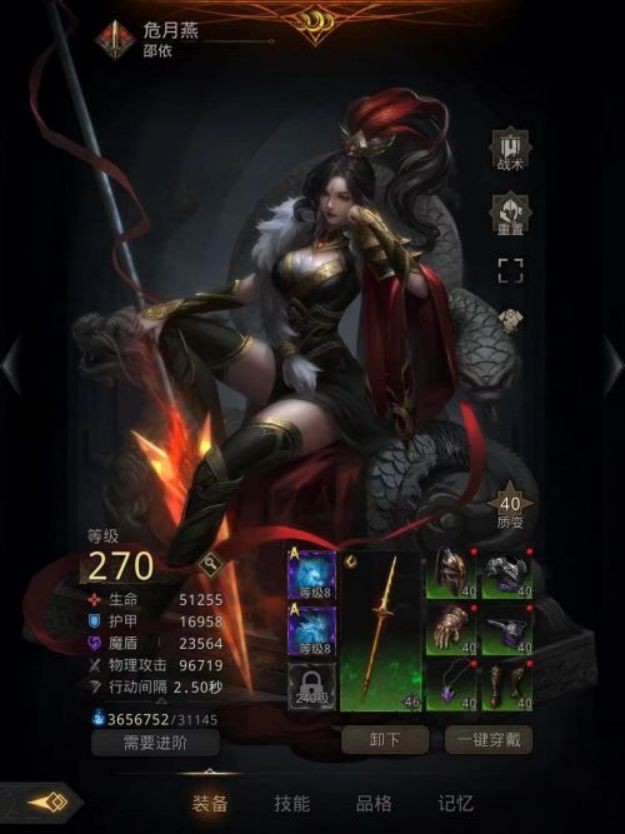 危月燕270:装备选择45暴击1,重点提升战吼伤害、首领伤害及盾甲生命伤害(战吼45,首领49,其余22)。使用忠诚挂坠饰品降低7点抗性,技能只释放群攻,搭配符文狂热1.5,携带两个魔物伤害加成与暴击装备。