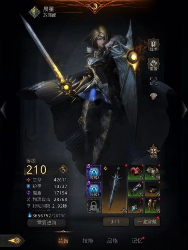 晨星210配置:装备35级豆剑,负面效果80%,依赖回复效果,不开启精准,启用推进与圣盾。符文选择救赎25,配备两个减伤6的魔物饰品,可替换为能源核心以增强毒系输出。