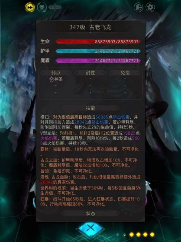 古老飞龙:血量1亿,攻击范围呈一排和V字形,输出一般。建议使用晨星守林人连续控制,boss暴击两次后即可击败。