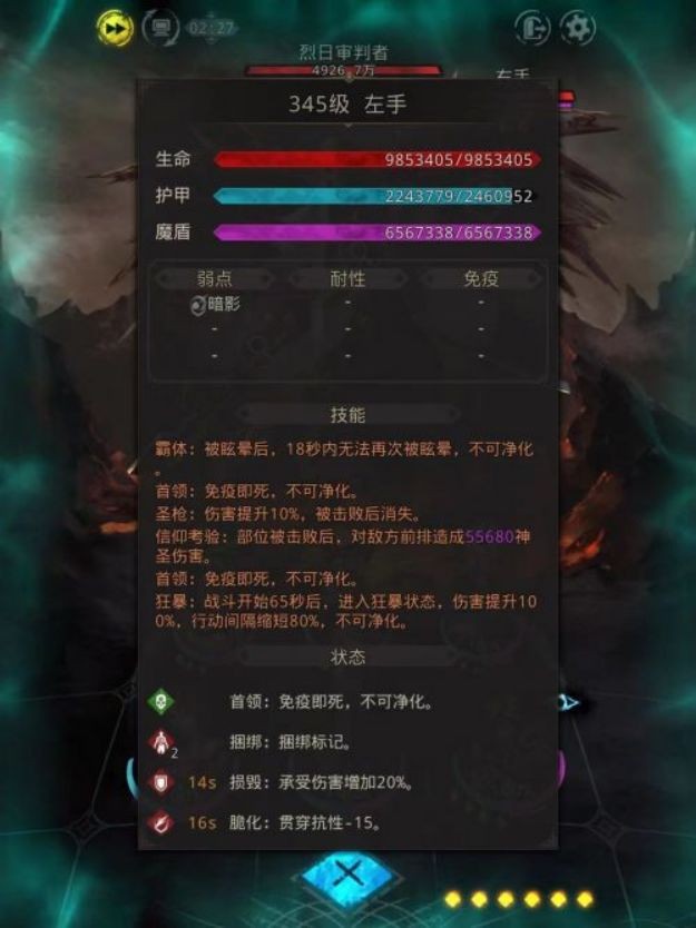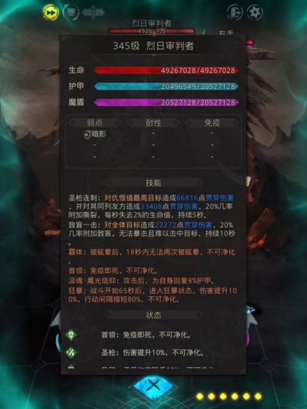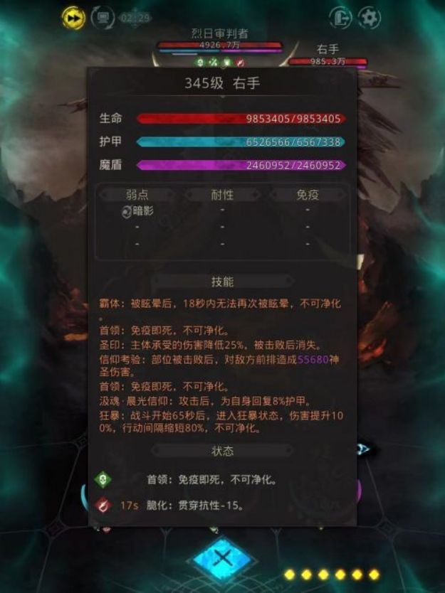 烈日审判者:攻击方式为单体及群体伤害,双手被击败时会对前排造成伤害(前排角色装备两个暗抗绿装可免受法术伤害)。战斗策略:开局集中火力攻击主体,利用晨星守林人持续控制,注意左手右手被击败时确保燕子处于后排,战斗结束前打出两次暴击即可通关。