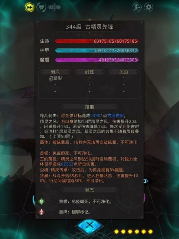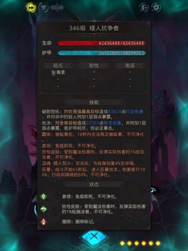 4. 矮人反抗者:物理攻击型矮人中四人最易对付,无反伤技能。工具人携带牺牲技能确保物理盾不破即可存活。战斗中晨星与守林人可无缝衔接控制技能,战斗结束前打出一次暴击即可取胜。若BOSS无法格挡,可考虑使用暗语致盲应对。