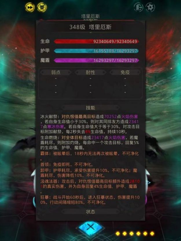 BOSS拥有3900万血量加1300万护盾,整体输出和回血能力都很强,还会附加减速负面效果。如果在两种情况下进行战斗:第一种是4豆情况下两次暴击吼叫无法击杀,可以参考萨古罗斯的打法,赌燕子第三次吼叫后仍能完成击杀,战斗会在第三次吼叫后结束。第二种是4豆输出足够完成两次暴击吼杀,或者6豆开局的情况下,工具人先手攻击并普攻一次后暂停,观察BOSS是否有捕缚、损毁、恐惧、减抗等状态。晨星用5秒控制住BOSS,这段时间足够施加各种负面状态,此时物理盾也快被打掉,接着使用远航吼降低抗性,燕子用3豆尝试两次暴击,6豆开局可尝试5豆两次暴击,这些都涉及概率问题,正常尝试10次左右基本能通过。目前队伍装备已成型,刚通关塞伦,接下来可以挑战二十年后蛮牛谷巨石之台的小BOSS,难度甚至高于塞伦,同样需要依赖两次暴击输出。如今大部分地图已通关,进入收尾阶段,预计1到1.5个月完成全部内容,等待240级进入源世界。新开放的海怪岬和启明镇前段地图也可适当刷资源。