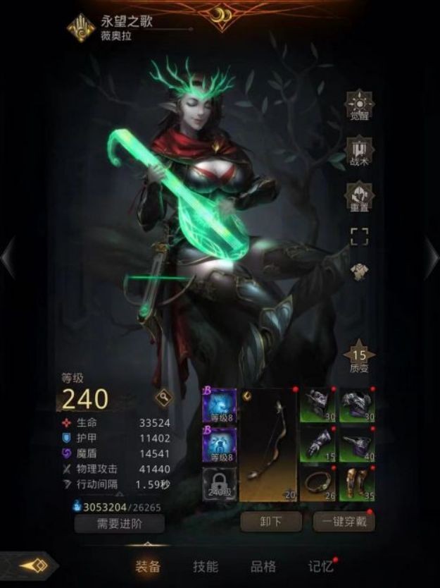 永望240:寂夜空弦,优先行动间隔词条,受回复效果,行动间隔4个5%,永恒之戒8%,野性之魂2个3%,符文选宁静,技能云开99,至少给两个友方使用,雨止需持续释放(必须使用永望双月240,品格洗练力量和血量,保证生存和治疗能力)。