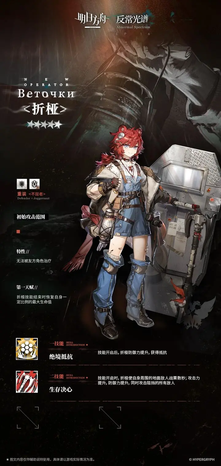 折桠属于防御型重装,主要特点是“屏障保护”与“反击控制”。初期部署时,她只能为自身提供护盾,但随着技能与天赋提升,护盾范围会扩展至周围友方单位,形成小范围防御圈。