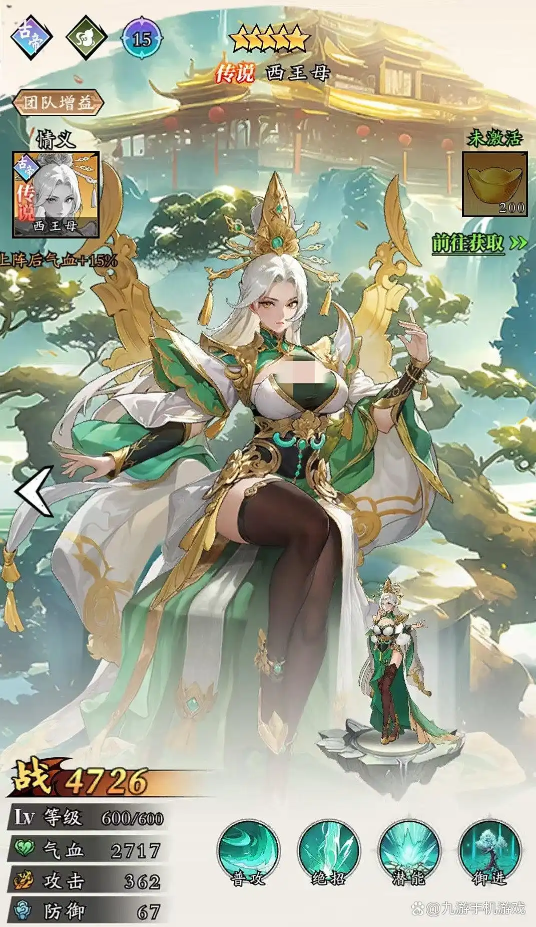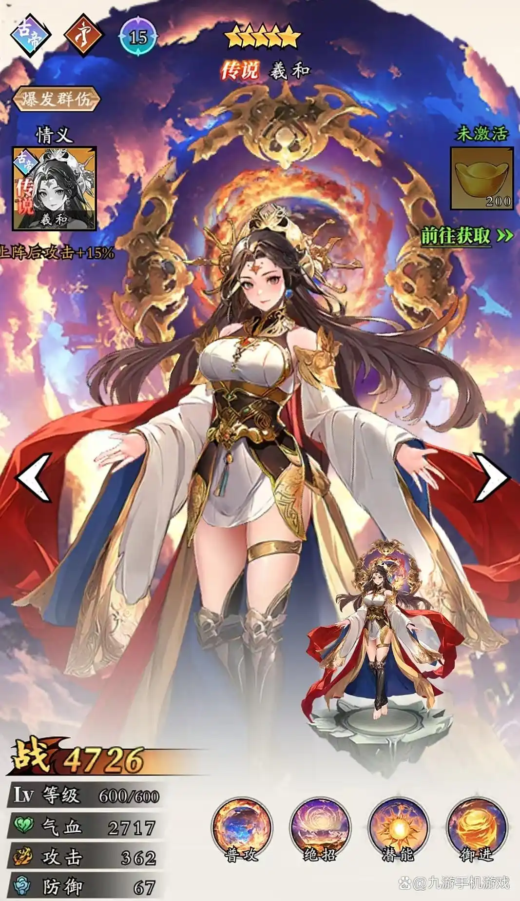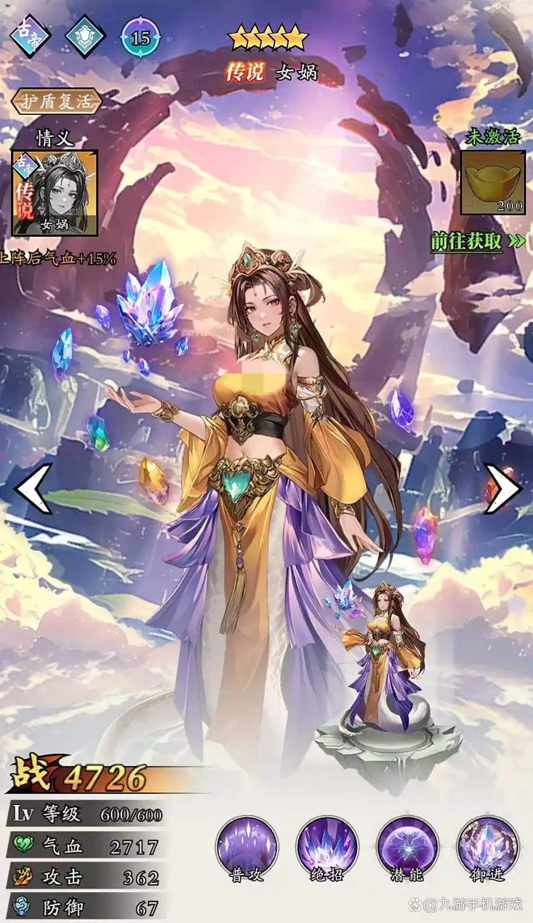 女娲:女娲是很好的辅助,拥有护盾复活等机制。其绝招可攻击对方全体,造成伤害的同时,有几率将我方全体单位身上的减益状态清除。若成功清除,我方全体额外再获得20%的伤害减免。达到十一星之后,释放技能可以给血量最低的友方单位额外添加无敌盾。