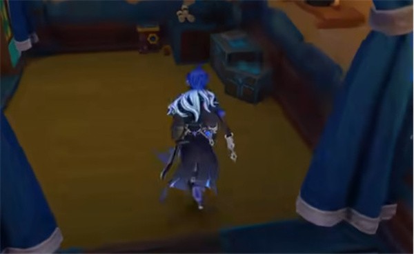 2、进入后沿着走廊前行,右侧角落可见堆放的木箱与宝藏堆。