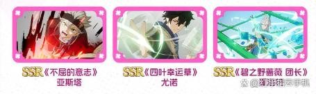 通过完成第一章主线任务和新手卡池,可获得 SSR《不屈的意志》亚斯塔、SSR《四叶幸运草》尤诺、SSR《碧之野蔷薇 团长》夏洛特;