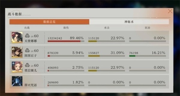 天使娜娜:0塑,洞三60,狂想满级,心相为非物质真情(40级未突破),共鸣10已调频。作为主力输出,追击是主要伤害来源。