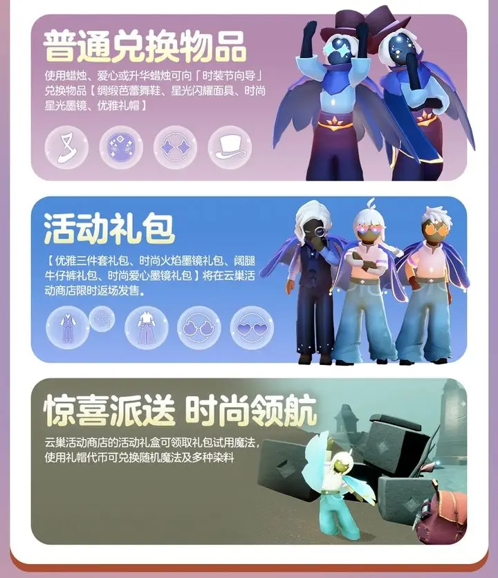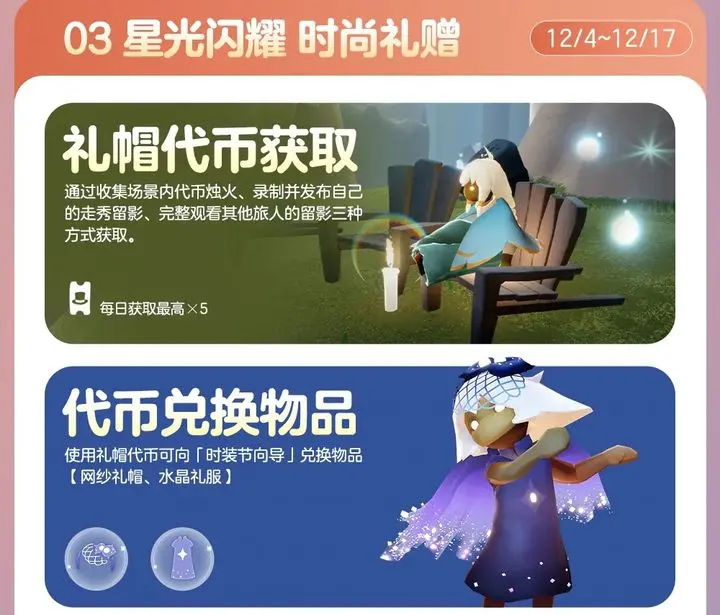 光遇2025时尚日活动有点让人小失望,竟然不推新物品,全是去年的复刻。活动里咱能挂机攒礼帽代币,换网纱礼帽和水晶礼服,还能用蜡烛、爱心换绸缎芭蕾舞鞋等四款经典装扮。想收集的别错过,赶紧来了解活动玩法!