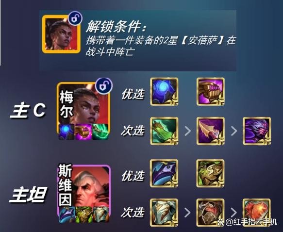 装备搭配:主C梅尔优选装备(蓝BUFF、帽子),次选(法爆、科技枪);主坦斯维因:优选装备(日炎、狂徒),次选(反甲、石像鬼)